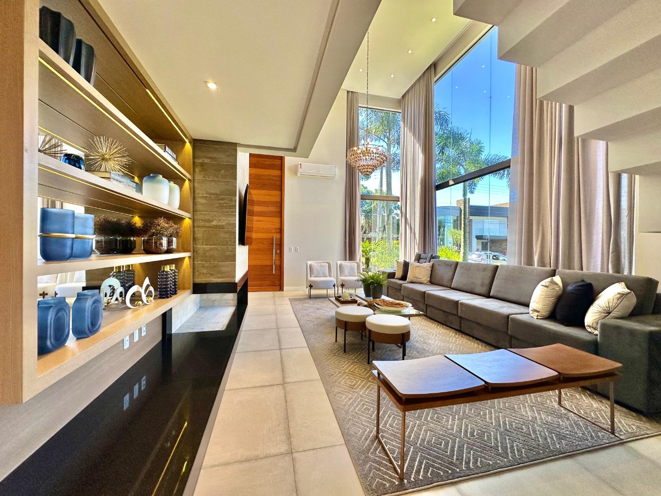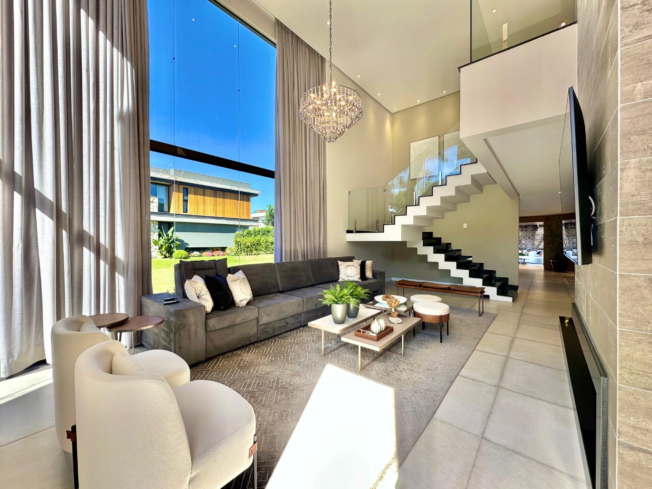 A área social foi desenhada para quem gosta de receber. Todos os ambientes são amplos e integrados, criando um grande espaço de convivência. O living climatizado, com lareira e televisor Smart, é perfeito tanto para um inverno com vinho quanto para um verão com a família reunida. A cozinha em estilo americano, com eletrodomésticos em inox, se conecta à churrasqueira giratória com bifeteira, à sala de jantar com mesa posta, cristaleira e a um lounge com estofado orgânico e poltronas giratórias — tudo em um único ambiente moderno, funcional e muito acolhedor. No mesmo pavimento, um escritório completo que facilmente pode ser usado como quinto dormitório, além de lavanderia com armários planejados, lavabo com revestimento que remete à madeira, garagem coberta para dois carros e gás central.